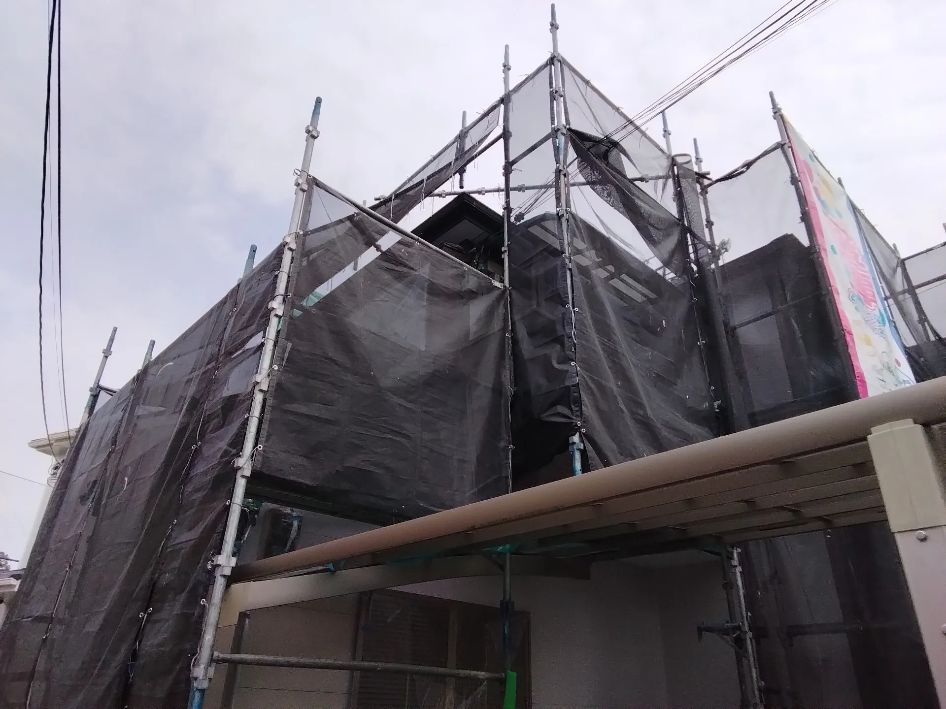 大阪府茨木市で外壁フル塗装、屋根塗装、シーリング工事、ベランダ簡易防水の中塗を施工しました。