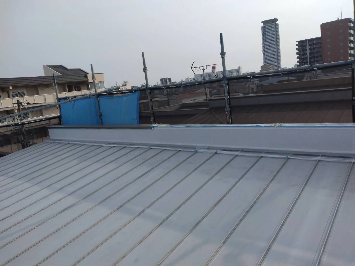大阪府吹田市で外壁フル塗装、屋根塗装、シーリング工事、ベランダ簡易防水工事の屋根塗装の上塗りまで完了しました。