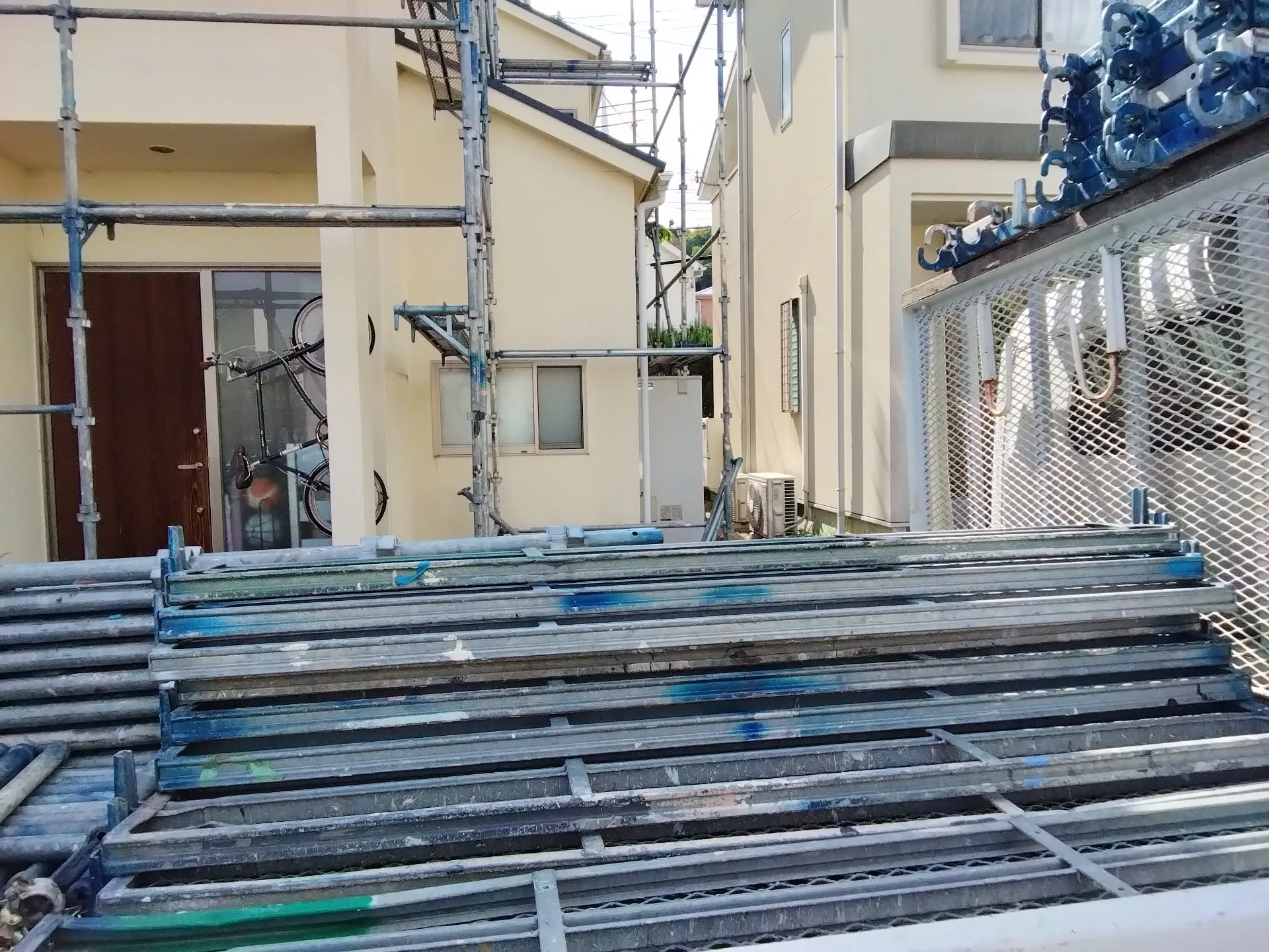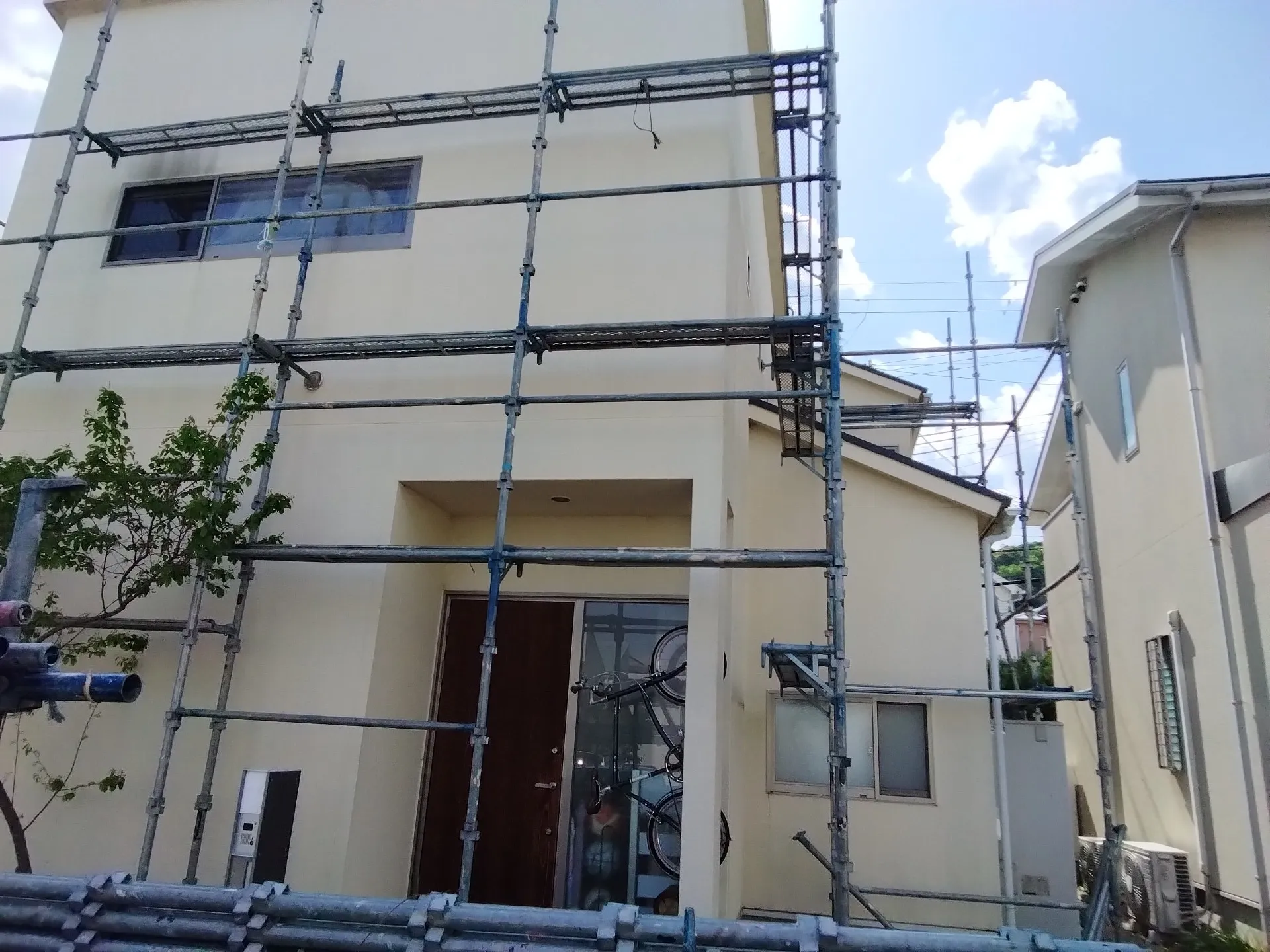 大阪府高槻市で外壁フル塗装、屋根塗装、シーリング工事、ベランダ簡易防水工事の足場着工しました。