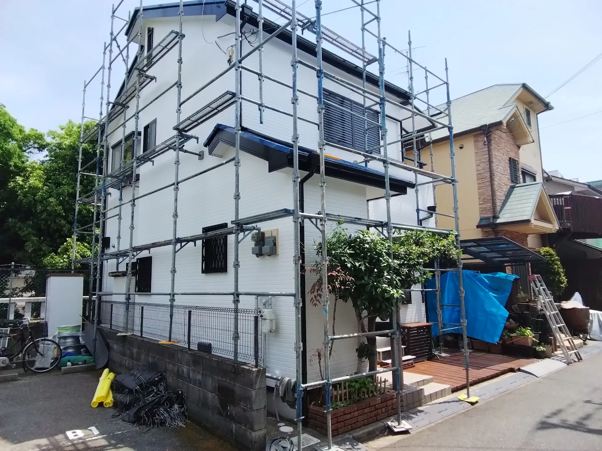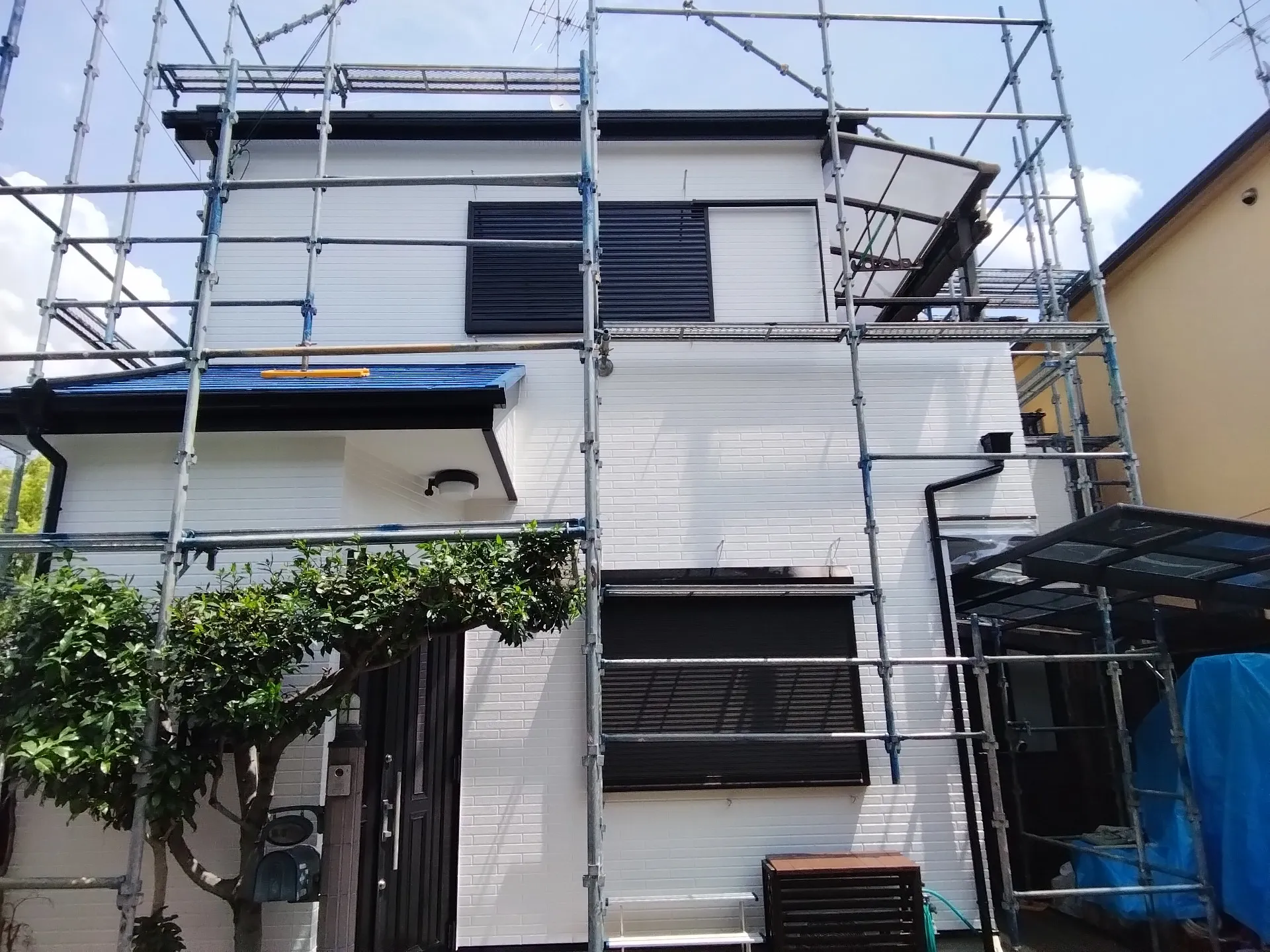 大阪府高槻市で外壁フル塗装、屋根塗装、シーリング工事、ベランダ簡易防水工事の足場解体しました。